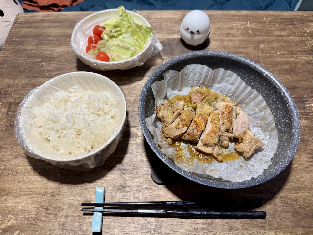 ご飯も炊け、17時40分、味付きの鶏肉を焼いて晩ご飯。