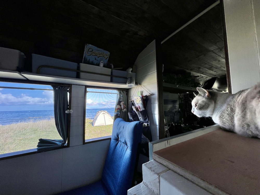 猫のみゅうちゃんは海を眺めています(=^・^=)
