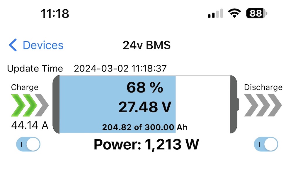サブバッテリーの残量はどれくらいになったかなと思いBMSのアプリを立ち上げると、なんと充電が1,200wを超えている!