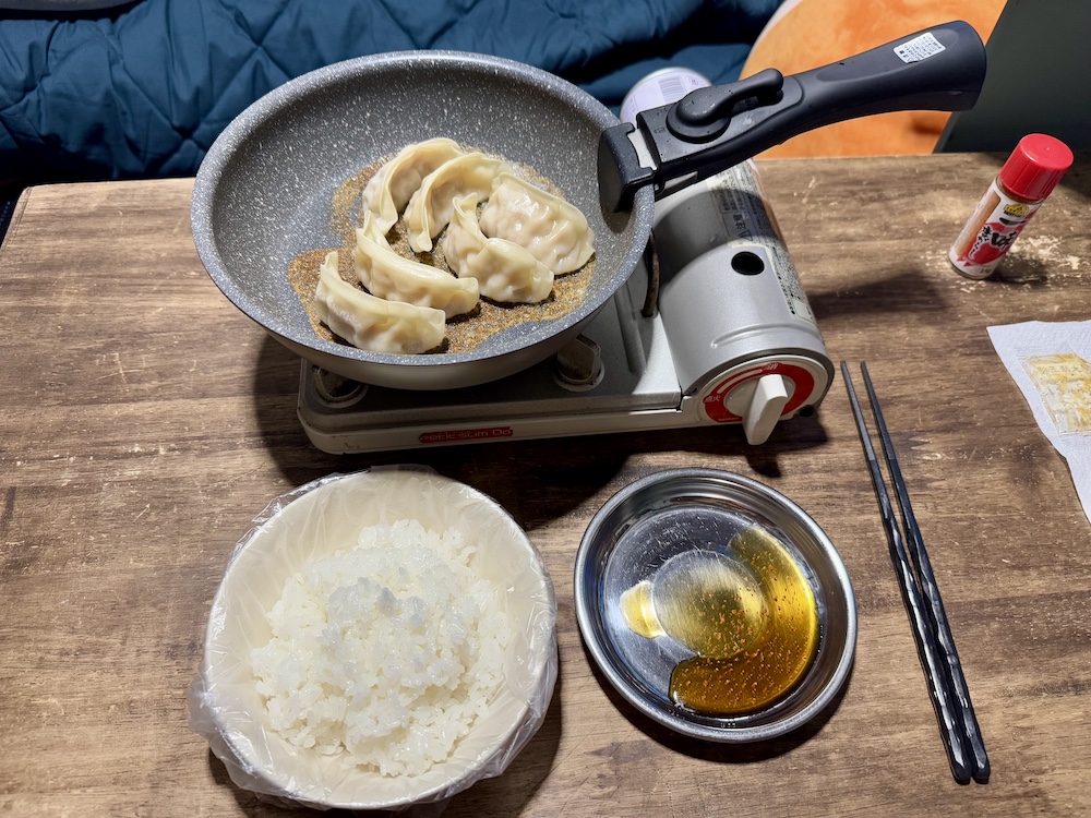 ご飯が炊けたので、冷凍餃子を焼きます(^_^)/